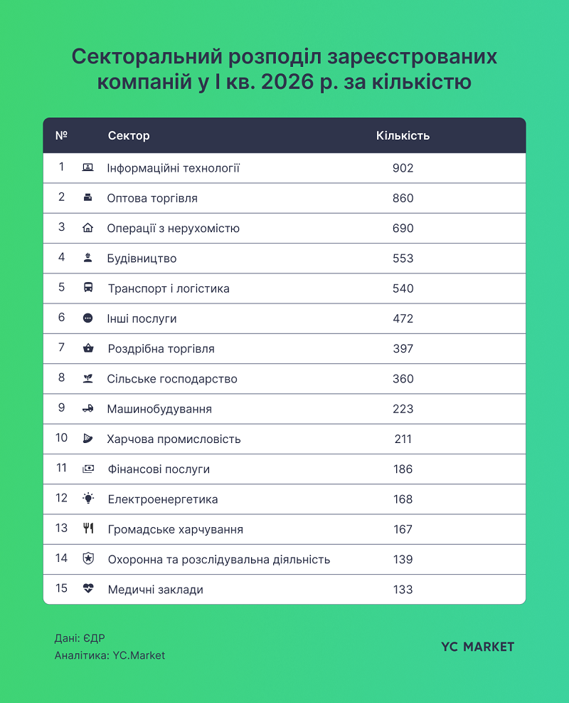 Як зазначили у новому дослідженні командою YC.Market від YouControl, порівняно з І кварталом 2025 року, склад регіонів-лідерів за кількістю реєстрацій нових компаній у І кварталі 2026 року не змінився. Водночас майже всі ці регіони наростили показники: м. Київ — з 2242 до 2600 компаній, Львівська область — з 576 до 674, Дніпропетровська — з 539 до 647, Київська — з 466 до 526. Винятком стала Одеська область, де кількість реєстрацій нових компаній зменшилася з 447 до 397, однак це не завадило їй зберегти місце серед лідерів.