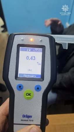 Після примусової зупинки електросамоката було встановлено, що водій має ознаки алкогольного сп’яніння. Результат огляду на приладі Drager показав 0,43 проміле.